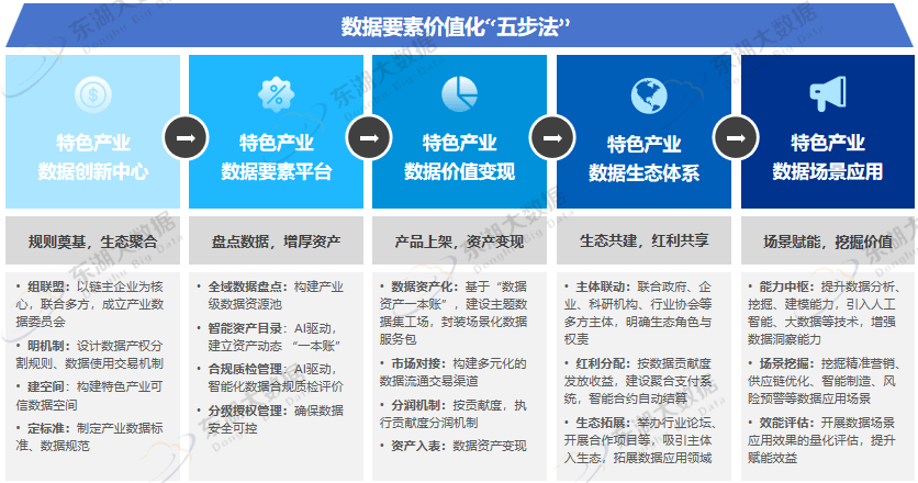 东湖大数据基于长期的研究与实践,总结形成了特色产业数据要素价值化“五步法”方法论。该方法论遵循“数据资源化→数据产品化→数据资产化→数据交易流通→创新数据场景应用”的数据要素市场化全链路底层逻辑,系统涵盖规则构建、数据整合、价值变现、生态共建与场景赋能五大环节,为产业升级提供“小切口、大价值”的转型范式,助力在数字经济浪潮中抢占特色产业升级制高点。