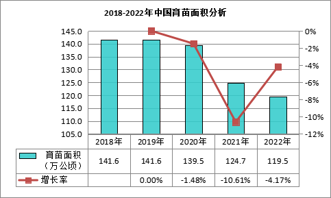 从苗木行业整体情况来看,“十四五”规划实施以来,全国苗木生产供应基本充足,但因受到新冠疫情和耕地保护等相关政策的影响,全国育苗面积自2020年开始下降,2021年降至124.7万公顷,新育面积10万公顷。
