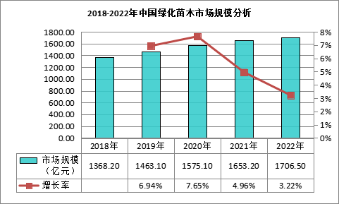 随着经济的快速发展,我国对于生态环境的重视度越来越高,绿化苗木市场规模逐步壮大。数据显示,2022年我国绿化苗木市场规模约为1706.50亿元。